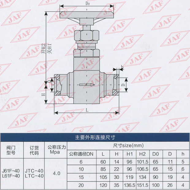 適用范圍 適用于公稱壓力為4.0MPa、公稱通徑為DN6-DN20進出口插焊連接、閥體材料為鋼質的直通截止閥和節(jié)流閥?! ¢y門屬性 公稱壓力為4.0MPa,試驗壓力為6.0MPa,適用溫度為-50°C-+200°C適用介質為氨、氟等?! 表示截止閥 L表示節(jié)流閥 T表示結構形式為直通式 C表示插焊連接 40代表公稱壓力為4.0MPa 40后不標注代表閥體材質為鍛鋼。